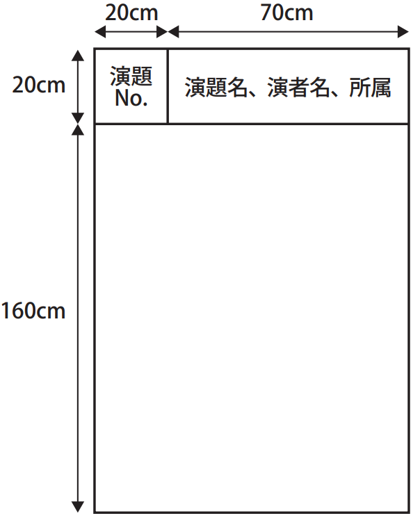 指定の展示スペースに演題名、所属、氏名を記入したタイトル(縦20cm、横70cm)を各自用意し貼ってください。展示スペースは、タイトルの下の縦160cm、横90cm のスペースです。